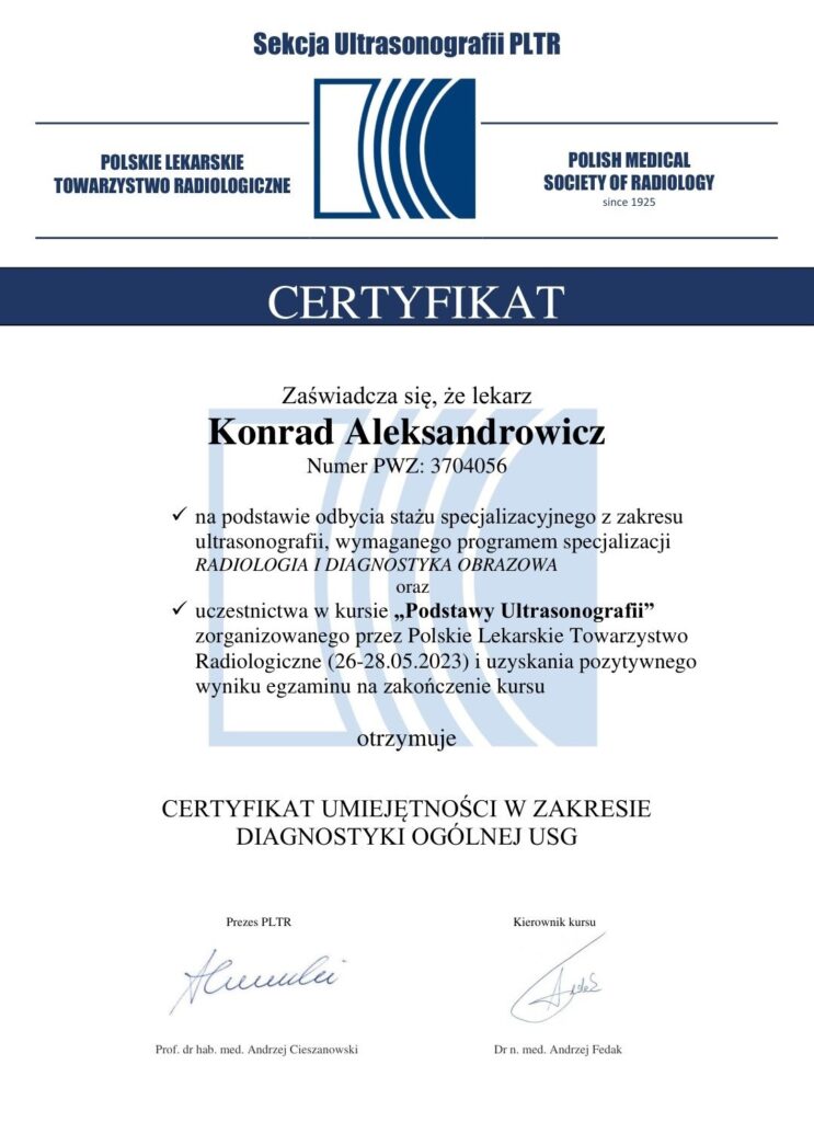 • Posiada certyfikat Polskiego Lekarskiego Towarzystwa Radiologicznego dotyczący wykonywania badań ultrasonograficznych.
