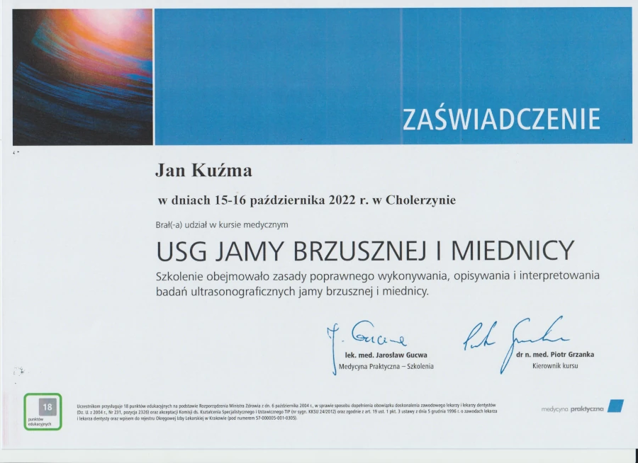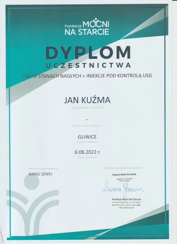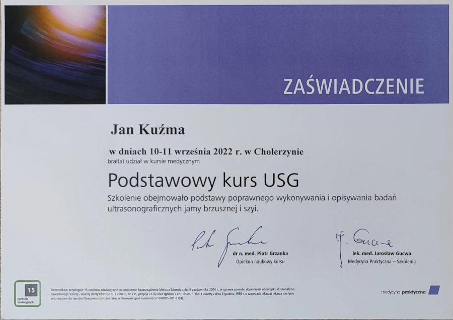 • Podnosi swoje kwalifikacje zawodowe uczestnicząc w kursach, a w swojej praktyce lekarskiej opiera się na wytycznych Polskiego Lekarskiego Towarzystwa Radiologicznego, którego jest członkiem.