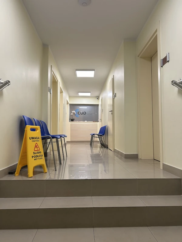 Mamy cały parter domu, który składa się z 3 gabinetów lekarsko-zabiegowych, rejestracji, poczekalni, kącika z przewijakiem dla niemowląt. A także pokoju socjalnego, toalet dla pacjentów w tym dla niepełnosprawnych i personelu. Gabinety są klimatyzowane. Docelowo tworzymy 4 gabinet.
